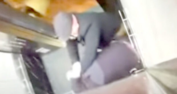 Las cámaras de seguridad captaron el momento en el que el sujeto sube de manera forzada al cubículo, sin importarle el reducido espacio.