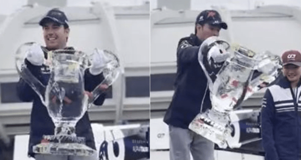 Checo Pérez subió a lo alto del podio y alzó un trofeo hecho de hielo, aunque el mismo piloto tapatío lo aventó ante la sorpresa de todos que estaban presentes.