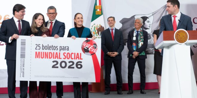 Claudia Sheinbaum levanta el trofeo de la Copa Mundial de Futbol a 100 días del inicio del torneo de la FIFA.