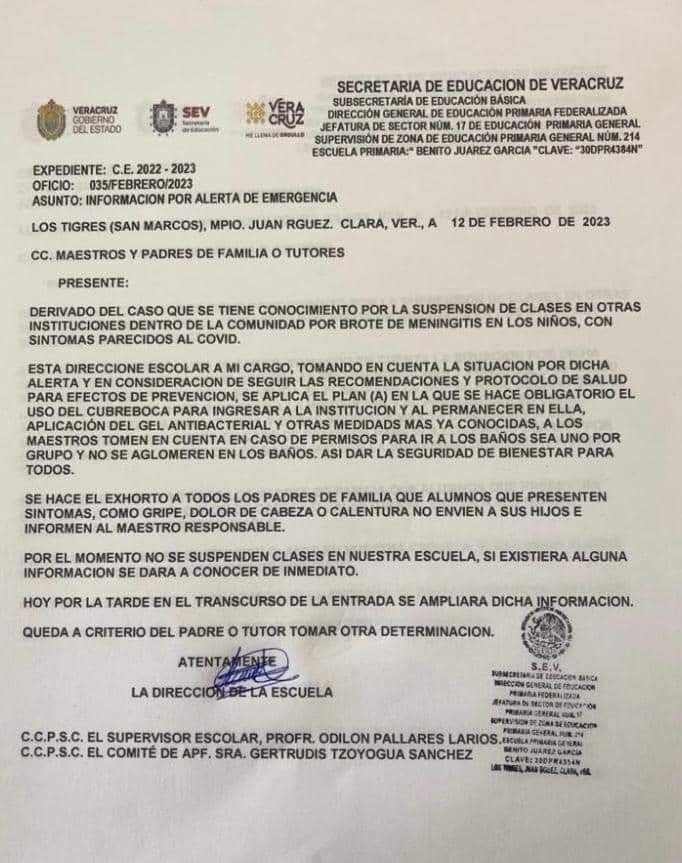 Es por ello que directivos de instituciones escolares, dieron parte a las autoridades de Salud de Juan Rodríguez Clara, y ellos a su vez a la Jurisdicción Sanitaria número 9, para que a la brevedad se instales un cerco sanitario y se eviten más contagios por la desinformación.