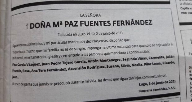 El anuncio fue publicado en el periódico, en donde doña María Paz Fuentes Fernández invita a su velorio a Juan Pedro Tejero García, Antón Montenegro, Segundo Viñas, Carmelita, Julián Francés, Rosa, Ana Tere Fernández, Ascensión Rodríguez, Susana, Silvia, Noella, Pilar Lerma, Ricardo y Juan.