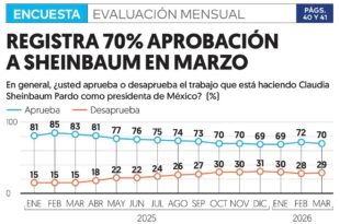 La aprobación ciudadana al trabajo que está haciendo la presidenta Claudia Sheinbaum registró 70 por ciento en marzo, mientras que el nivel de desaprobación fue de 29 por ciento, de acuerdo con la encuesta nacional mensual de El Financiero. La …