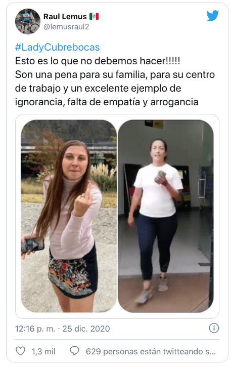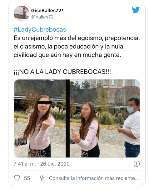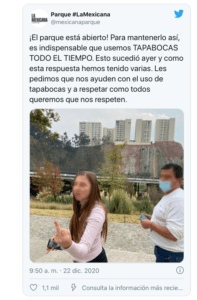 Asimismo, el Parque La Mexicana reportó el hecho, subrayando  que permanece abierto pero para ello es indispensable el uso del cobrebocas y aunque ocultó la identidad de la mujer, en Twitter se volvió tendencia y circulan imágenes de ella, reprobando su irresponsabilidad por desacatar una medida sanitaria ante el incremento de contagios de COVID-19 en la Ciudad de México.