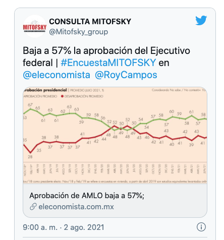 AGENCIAS.- La aprobación del presidente Andrés Manuel López Obrador (AMLO) disminuyó entre junio y julio del 2021, al pasar de 58 a 57 por ciento, de acuerdo con encuesta de aprobación presidencial realizada por Mitofsky para el diario El Economista.