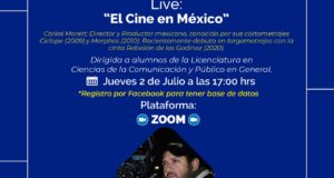 #WebinarComunicación | Carlos Morett, director y productor del largometraje Rebelión de los Godínez (2020), disertará este jueves la conferencia «El Cine en México», que es organizada por la Facultad de Ciencias de la Comunicación de la Universidad de Sotavento, cuya …