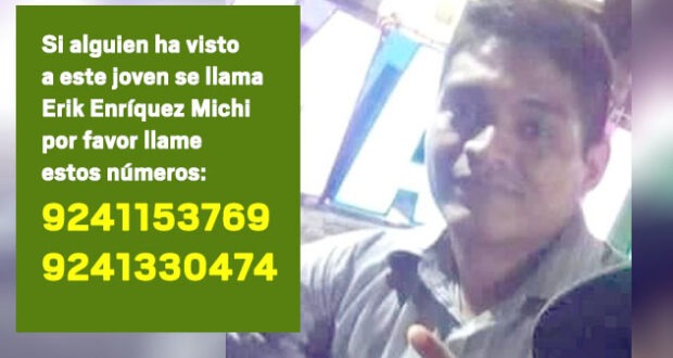 Hola buenos días por favor si alguien ha visto a este joven se llama Erik Enríquez Michi por favor llame estos números9241153769 o 9241330474Por lo que se pide a familiares, amigos y conocidos que si saben de su paradero ayuden para que vuelva a casa sano y salvo.
