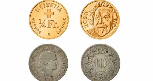 En oro puro, con sólo 999 unidades acuñadas, la moneda de 1/4 franco suizo de valor nominal (0.27 dólar), pesa 0.063 gramo.