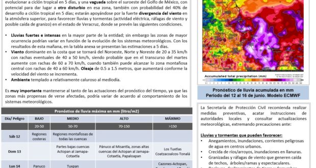 Ante esta situación recomienda precaución por posibles crecidas de ríos y arroyos de respuesta rápida, deslaves, derrumbes, así como inundaciones pluviales en centros urbanos.