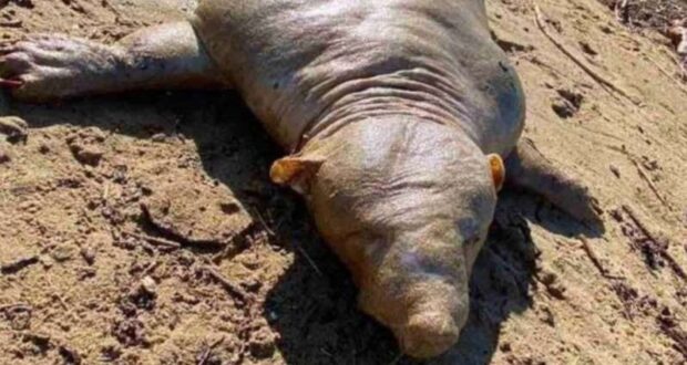 El animal encontrado tiene cuatro patas, no tiene pelo y pareciera ser un pequeño hipopótamo que científicamente no lo es. La criatura apareció cerca de un río en el complejo turístico Gournes. Fue a través de las redes sociales en donde comenzaron a circular las imágenes del hallazgo. En éstas aparece el animal tendido sobre la arena, rodeado de escombros.