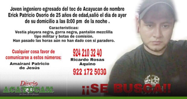 De acuerdo al boletín se trata del joven ingeniero Erick Patricio Osorio de 25 años de edad y desde el martes que salió de su casa no ha vuelto.