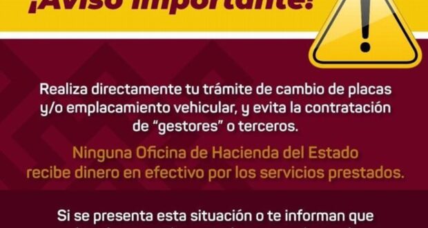 En dicho aviso señalan: “ninguna oficina de Hacienda del Estado recibe dinero en efectivo por los servicios prestados”.