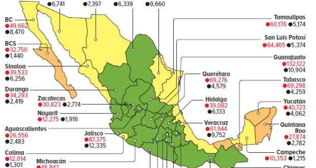 AGENCIAS.- Casi todo México se pinta de verde. Al actualizar el semáforo epidemiológico, la Secretaría de Salud informó que, a partir del 7 de junio, habrá 19 entidades federativas en color verde, con riesgo bajo; nueve en color amarillo, con riesgo medio, y solamente cuatro en naranja, con riesgo alto, que son Baja California Sur, Quintana Roo, Tabasco y Yucatán y sigue sin haber estados en rojo.