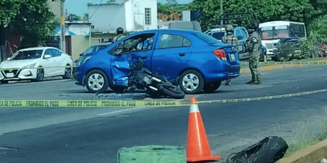 La mañana de este martes se registró un fuerte accidente entre un auto y una moto en calles de Veracruz.