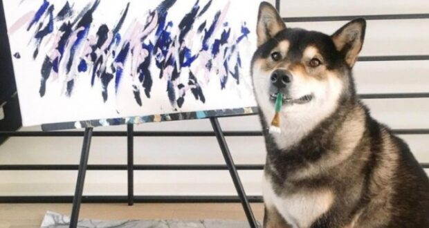 Hunter es un Shiba Inu de 8 años que, desde 2017, se ha dedicado a la pintura, haciendo obras abstractas con un pincel en su hocico para hacer los trazos.