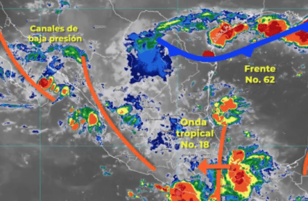 En tanto, el Frente Frío número 62, que se encuentra fuera de temporada, el ingreso de humedad proveniente del Golfo de México, canales de baja presión sobre la Sierra Madre Occidental y el oriente y sureste del país, así como el paso de la Onda Tropical número 18 provocarán lluvias en gran parte del país.
