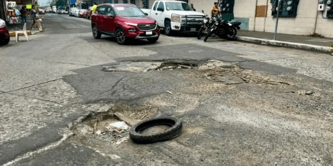 Automovilistas se quejan por dos mega baches que se encuentran en la esquina de Juan Soto y González Pages en la zona de mercados en Veracruz