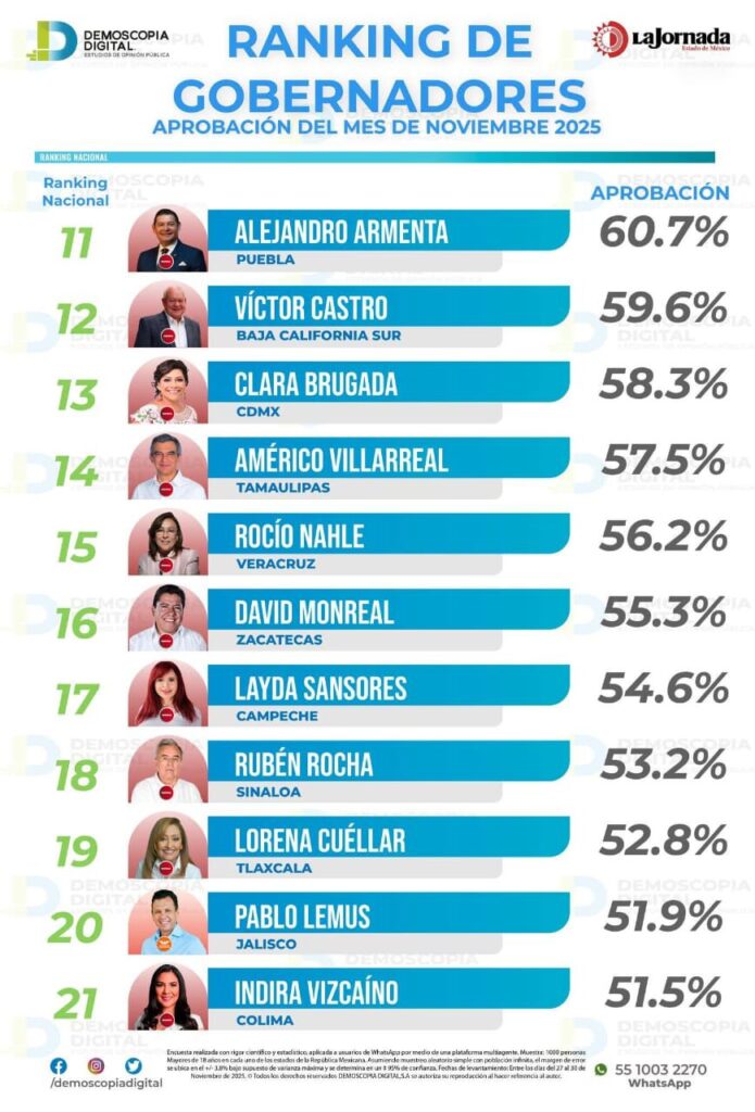 Los avances financieros alcanzados en Veracruz bajo el liderazgo de Rocío Nahle comienzan a reflejarse también en los indicadores nacionales. De acuerdo con Demoscopia, la mandataria se sitúa hoy en el lugar 15 a nivel nacional, con un 56.2% de aprobación ciudadana, una posición que responde al respaldo social hacia una coordinación, responsable y cercana al Pueblo derivado del proyecto de la Cuarta Transformación.