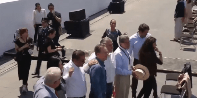 Eso sucedió al inicio de la asamblea popular de la presidenta en el Zócalo capitalino, justo cuando salió de Palacio Nacional, y subiría al templete.