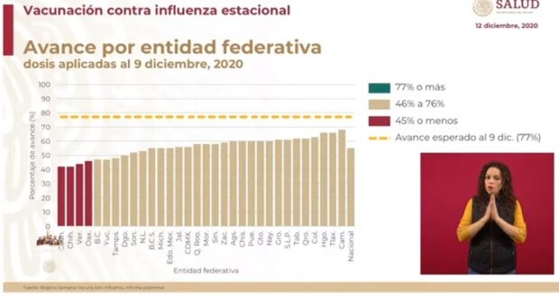 “El estado de Campeche y Tlaxcala son los dos estados con mayor avance hasta el momento, y Coahuila, Chihuahua, Veracruz y Oaxaca nos han reportado el menor de los avances que va por debajo del 50 por ciento; bueno, están en rojo porque es por debajo del 45 por ciento. Ninguno ha alcanzado el avance esperado del 77 por ciento”, dijo en conferencia de prensa.