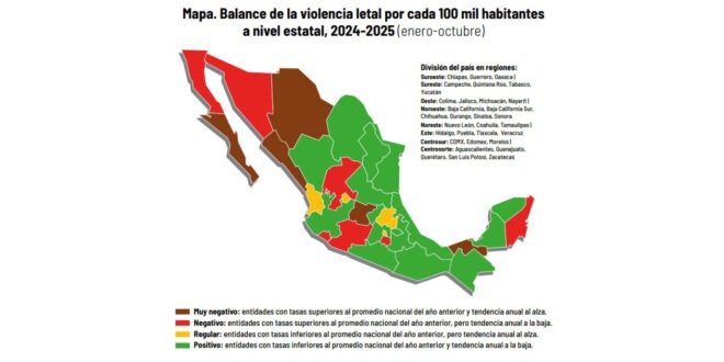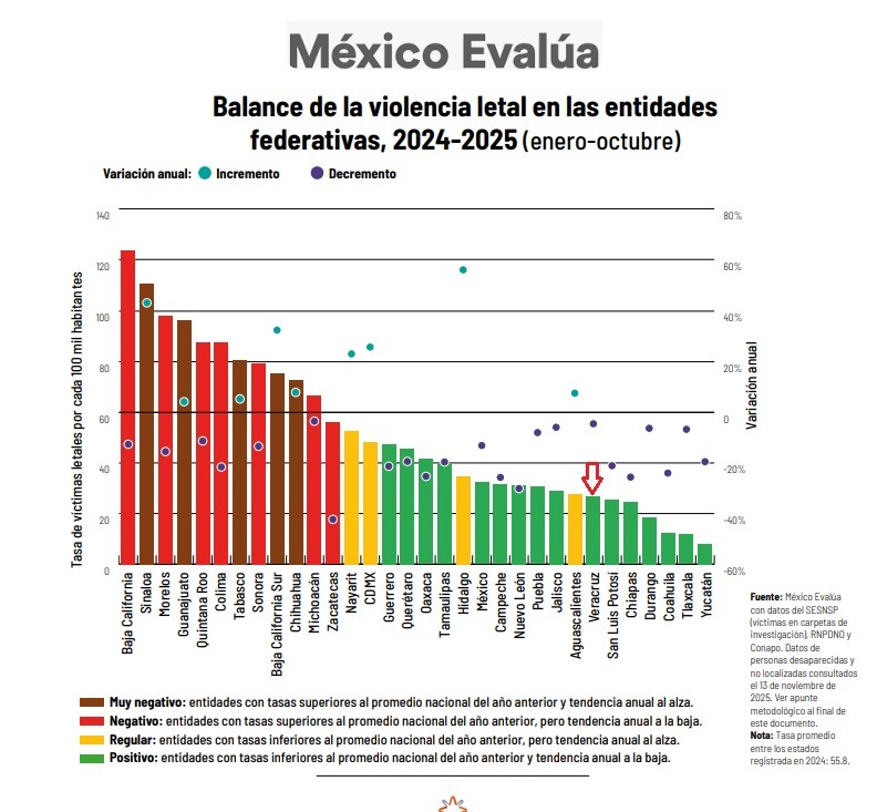 El Centro México Evalúa precisó que la información proviene del Secretariado Ejecutivo del Sistema Nacional de Seguridad Pública con corte a octubre del 2025.