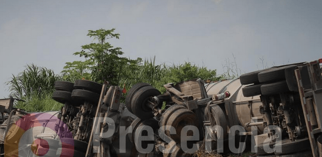 Un autotanque doble remolque cargado con turbosina terminó volcado sobre la carretera federal 185 Transístmica, en el tramo correspondiente al libramiento Sayula–Aguilera.